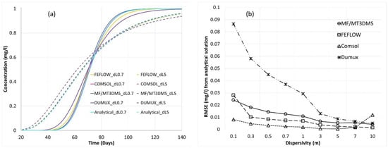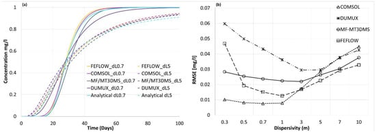 The temporal variation of concentration of the analytical solution [1] and the numerical simulation of the breakthrough curves (BTCs) at the observation point, 50 m from the point source, is presented in Figure 4, for two different dispersivity values, i.e., 0.7 and 5 m. The dispersivity value of 5 m is used as a standard scenario since it represents a median value of the studied dispersivity range 0.01 to 10 m, and because 5 m is a common field dispersivity measured [34,35]. The relative error is estimated by comparing numerically simulated BTCs with that obtained by the analytical solution using the standard Root mean squared error method (RMSE). The two distinct sets of curves in Figure 4a reveal that all four numerical and the analytical solution are sensitive with respect to changes in dispersivity, i.e., 0.7 m and 5 m. The numerically simulated BTCs reveal a good match with the analytical solution since the RMSE value is less than 0.1 mg/l (i.e., <10% of C0). The RMSE of the BTCs for different dispersivity values is shown in Figure 4b for the participating numerical simulators in problem 1D.