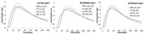 Figure 6a–c shows the simulated breakthrough curves in the reservoir’s top, middle, and lower aquifer, respectively. Since no analytical solution is available for this 3D case, the breakthrough curves were only compared. The tracer breakthrough in the different layers varies significantly in peak concentration and arrival time (Figure 6a–c). Peak concentrations are maximum in all layers simulated in COMSOL. This is especially evident in the top aquifer (Figure 6a). DuMuX indicates a significantly stronger “smoothing”, i.e., higher concentrations during the rising limb and the tail and lower peak concentration, than the other simulators. This effect is already revealed in the 2D and 1D simulations for low dispersivities. FEFLOW and MODFLOW/MT3DMS range in the sharp peak between COMSOL and DuMuX. While MODFLOW/MT3DMS shows significantly lesser peak concentrations than COMSOL for all layers, FEFLOW has comparable concentrations to MODFLOW in the top layer (Figure 6a), concentrations to COMSOL in the middle layer (Figure 6b), and in the bottom layer, the concentration peak lies in between those two (Figure 6c). The peak arrival (BTC) in MODFLOW/MT3DMS is the slowest, while DuMuX is the fastest for all three layers.
