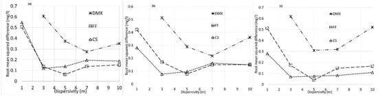 The difference in the tracer BTCs is studied using MODFLOW/MT3DMS as a reference since MODFLOW/MT3DMS is widely used and eventually verified for groundwater flow for the most occasion than other software. The root mean squared differences for various dispersivity values (Figure 7a–c) show significantly higher variations comparing 1D and 2D cases. While the lower dimensional (1D and 2D) problem errors range between 0.1 and 8%, the difference range between approximately 0.1 and 0.7 mg/L or 4% to 25% in 3D cases compared to the MODFLOW/MT3DMS concentration. As for the other simulations, dispersivity around 3 m achieves the “best” fit for COMSOL and FEFLOW. For DuMuX, the fit can be improved further if slightly higher dispersivity around 7 m is chosen.