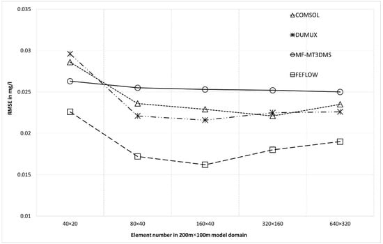 The accuracy of the advective dispersive equation (Equation (3)) is estimated through BTCs by solving the transport equation only using different grid sizes and assuming the tracer is conservative. Figure 8 shows the influence of spatial discretisation on the accuracy of the solution for benchmark Problem 2. Here, grid sensitivity is conducted for a dispersivity value of 5 m. All simulators show a lower RMSE value for a mesh, 80 × 40 elements, than the 40 × 20 element mesh. For finer discretisation, the decrease of the RMSE is low compared to the difference between the 40 × 20 element mesh and the 80 × 40 element mesh. Spatial discretisation is usually a ‘trade-off’ to the accuracy of the results and ‘resource cost’. Here, the resource cost is estimated from the computer’s virtual memory requirements to generate the grid and the computational time. For COMSOL, DuMuX, and FEFLOW, the RMSE value increases again for the finer mesh. FEFLOW has revealed higher accuracy compared with other software.