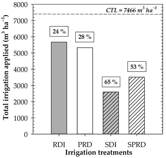 Total irrigation for each irrigation treatment in ‘Crimson Seedless’ table grapes. The dashed line indicates the amount received in the CTL (fully-irrigated) treatment. The percentages of the water saved in each deficit irrigation treatment: RDI and PRD (regulated deficit) and SPRD and SDI (sustained deficit) with respect to the CTL treatment are shown in boxes.