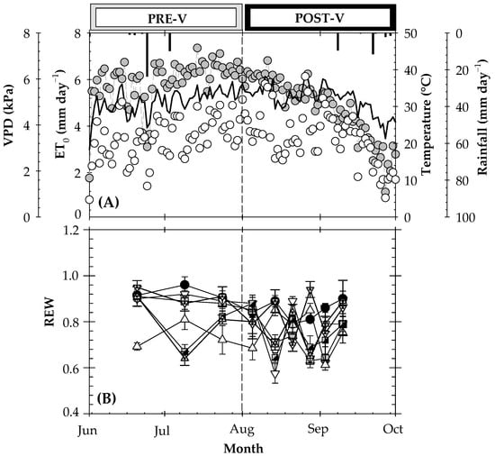 )). Means ± SE of n = 4 FDR probes. The statistical analysis in Figure (B) was omitted for better clarity. Vertical bars indicate the phenological periods of pre-veraison (PRE-V) and post-veraison (POST-V), respectively.
