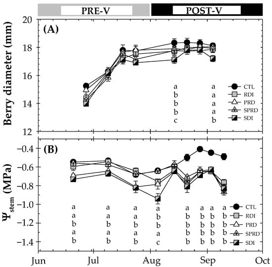 )). Different letters indicate significant differences for each date and parameter, according to Duncan’s multiple range test (p ≤ 0.05). Vertical bars indicate the phenological periods of pre-veraison (PRE-V) and post-veraison (POST-V), respectively.