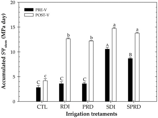 Accumulated water stress integral (SΨstem) during the phenological periods of pre-veraison (PRE-V, black bars) and post-veraison (POST-V, white bars) of ‘Crimson Seedless’ table grapes for each irrigation treatment: CTL (full-irrigated), RDI and PRD (regulated deficit), and SDI and SPRD (sustained deficit). Different upper- and lower-case letters indicate significant differences between irrigation treatments according to Duncan’s multiple range testing (p ≤ 0.05) for pre- and post-veraison periods, respectively.