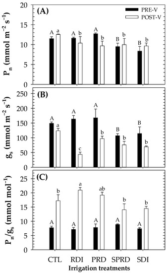 During the pre-veraison period, the CTL treatment averaged Pn = 11.48 µmol m−2 s−1 and gs = 149.16 mmol m−2 s−1, similar to that obtained in the regulated irrigation practices of RDI and PRD (moderate deficit). However, the lowest values obtained in the sustained treatments (severe deficit) led to a significant reduction by 17% (in Pn) and 28% (gs) for the SPRD treatment, and 27% (in Pn) and 23% (gs) for the SDI treatment, respectively, as compared with the CTL treatment (Figure 5A,B). Moreover, at this phenological period, all irrigation treatments obtained the same levels of Pn/gs in a range from 7.14–8.84 µmol mol−1 (Figure 5C).