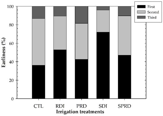 Interestingly, the earliness evaluated at the first harvestable pick was highest in all the deficit treatments as compared with the CTL treatment (Figure 6). Indeed, the values obtained at this time were higher in the SDI treatment, followed by RDI > SPRD > PRD > CTL. Lastly, in the last pick of the harvest, the SDI treatment obtained the lowest level of earliness as compared to the other irrigation treatments.