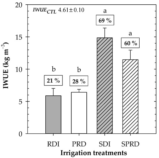 Irrigation water use efficiency (IWUE) of each irrigation treatment. The increase (%) in IWUE for each deficit irrigation treatment was: RDI and PRD (regulated deficit) and SPRD, and SDI (sustained deficit) with respect with the CTL treatment are shown in boxes. Different letters indicate significant differences according to Duncan’s multiple range test (p ≤ 0.05).