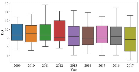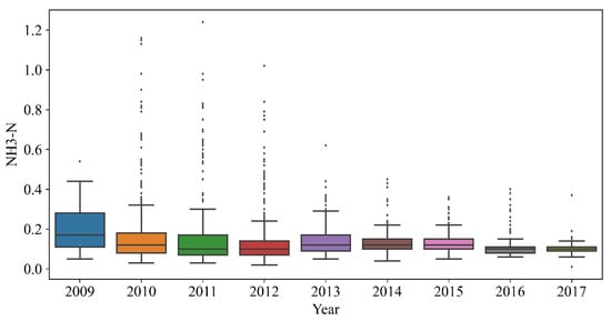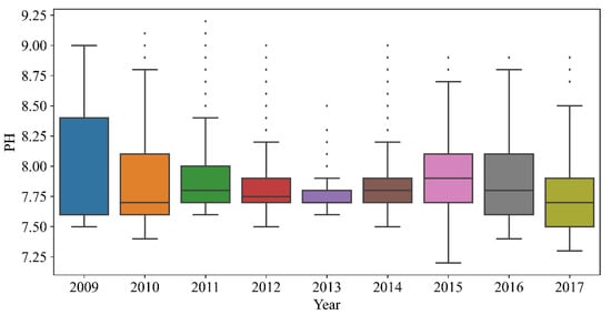 Table 1 shows the mean value, the highest value, and the number of missing values of the three water quality indicators. Figure 1 represents the frequency distribution of water quality indicator data. Intuitively, the values of DO were concentrated in (5, 15), and the distribution was relatively average. The values of pH were mostly concentrated in (7.5, 8), which did not conform to a normal distribution. The values of NH3-N were mostly concentrated in (0, 0.2), showing a strong concentration. For the year as a unit of water quality data for the details of the division, Figure 2, Figure 3 and Figure 4 show the DO, pH, and NH3-H in each year of the data distribution, including the average value, the highest value, and abnormal values. There was a certain regularity in the distribution of DO. The pH also gradually stabilized, and NH3-H showed a decreasing trend year over year. Figure 5 shows the frequency distribution of the water quality level. The water quality data had five levels, and the proportion of each level was about the same. There were a certain number of abnormal values in the water quality indicator data, so we first carried out data preprocessing.