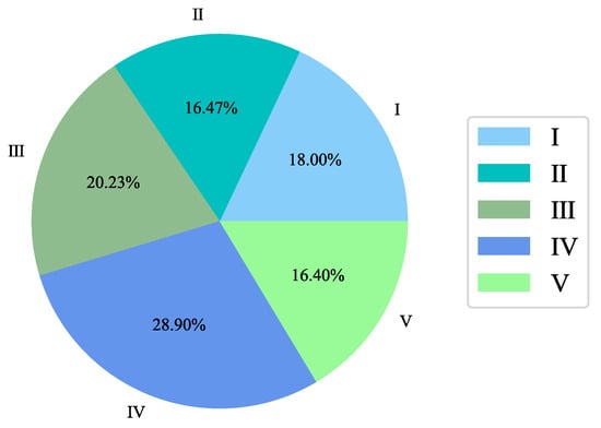 For the water quality class multi-classification problem, multiple evaluation metrics are needed. In this paper, three evaluation metrics—accuracy, F1-score, and confusion matrix—were used. The confusion matrix is shown in Table 3. Each row of the confusion matrix indicates the true category of the data. The number of all data instances in each row indicates the number of instances in this category. Each column represents the prediction category, and the total number of each column represents the number of predictions for this category. The accuracy is the proportion of the number of correctly classified samples to the total number of samples in the given data, as shown in Equation (14). The F1-score is the summed average of accuracy and recall, as shown in Equation (17) [34,35].