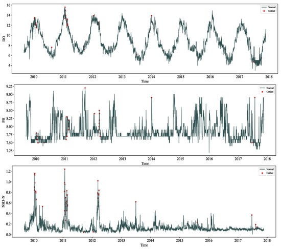 Considering the small sample data, the outlier ratio parameter setting was small; after setting the parameters, we detected the outliers on the three water quality indicator data, and the detection results are shown in Figure 6; for the detected outliers, we chose to carry out deletion and used the linear interpolation method.