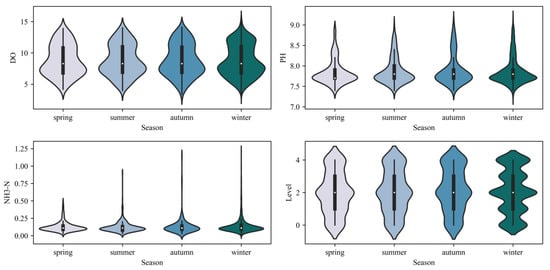 In this study, the data sets were divided by seasons, and the characteristics on the overall and four-season data sets were counted. As can be seen from Figure 8, the pH was more stable in all seasons; DO was lower in summer and higher in winter, which is consistent with the physical and chemical law that DO is lower the higher the water temperature is; NH3-N was lower in summer and autumn and higher in winter, which is generally due to the low temperature leading to lower biochemical treatment efficiency of water flow and slower degradation of ammonia nitrogen. The mean value of water quality evaluation level in each season was approximately the same; in spring, summer, and autumn, the distribution was very similar, and in winter, there were some fluctuations in the distribution, which may be related to the low temperature.