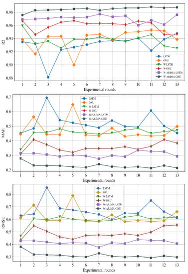 From the comparison graph of the prediction effects, it can be seen that the R2, MAE, and RMSE values of single deep learning models such as LSTM and GRU models fluctuated more as the time step increased, and the prediction effects of the LSTM and GRU models showed a decreasing trend when the time step exceeded 90 [36]. After adding wavelet decomposition, the variation of the R2, MAE, and RMSE values of the LSTM and GRU models became smaller, the prediction stability improved substantially, and the prediction effect improved, which also proved that the effect of adding wavelet decomposition would improve nonstationary time-series data. Finally, when the ARIMA model was used to predict the decomposed trend terms instead of the LSTM and GRU models, the R2 value was greatly improved compared with the previous models, and the MAE and RMSE values were significantly reduced, with the R2 value of the W-ARIMA-GRU model exceeding 0.98 at different time steps, while the MAE and RMSE were below 0.3 and 0.4, respectively, showing the model’s great advantages.