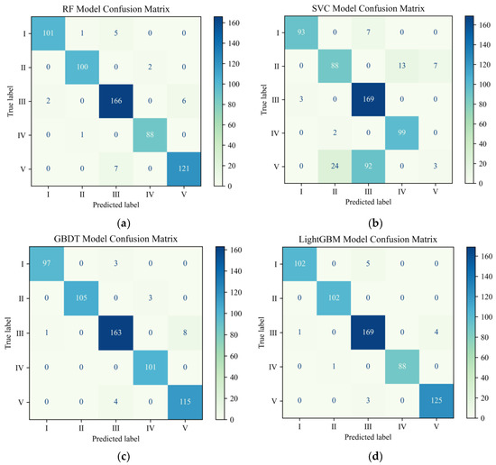 Confusion matrices of different models. (a) Confusion Matrix of RF Classifier. (b) Confusion Matrix of SVM Classifier. (c) Confusion Matrix of GBDT Classifier. (d) Confusion Matrix of LightGBM Classifier.