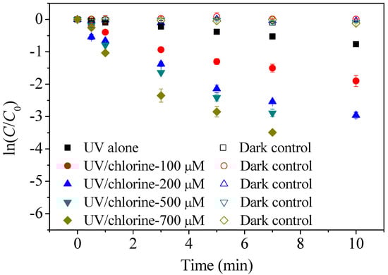 During direct UV irradiation, obvious degradation of CTZ was observed and no obvious degradation in the dark controls was observed (Figure 1). These results indicate that CTZ was photodegradable under direct UV irradiation, and the degradation of CTZ followed pseudo first-order kinetics. The observed degradation rate constant (kobs) of CTZ under direct UV irradiation was calculated to be (0.08 ± 0.01) min−1. In a previous study, the photodegradation of CTZ under UV irradiation was also observed [38]. In the UV/chlorine system, the degradation rate of CTZ was faster than that under direct UV irradiation (p < 0.05, Figure 1). The kobs of CTZ increased to (0.19 ± 0.01), (0.29 ± 0.02), (0.42 ± 0.03), and (0.50 ± 0.02) min−1 with concentrations of free chlorine increased to 100, 200, 500, and 700 µM, respectively. These results demonstrated the important role of free chlorine in the removal of CTZ. The degradation efficiency reached up to 84.9% within 10 min of treatment and exceeded 90% within 15 min of treatment at the free chlorine concentration of 100 µM in the UV/chlorine system. Thus, the free chlorine concentration of 100 µM was selected in the following experiments.