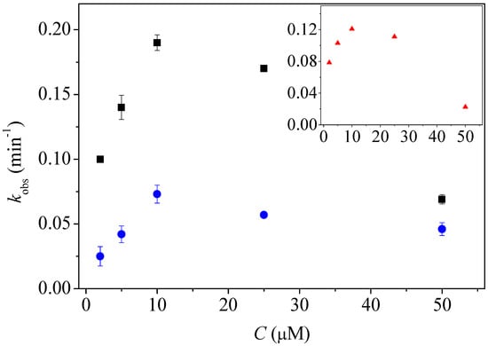 In the UV/chlorine system, the initial concentration of organic pollutants was shown to affect their degradation kinetics and efficiencies [39]. Therefore, the effect of initial concentrations of CTZ on its degradation was studied, and the results are exhibited in Figure 2 and Figure S3 in the Supplementary Materials. As shown in Figure 2, the kobs of CTZ showed a first-increase and then-decrease trend under UV irradiation as well as the UV/chlorine treatment. The fastest degradation rate of CTZ was observed with its initial concentration of 10 µM. With the increase in initial concentration of CTZ from 10 µM to 50 µM, the kobs of CTZ under direct UV irradiation and in the UV/chlorine system decreased 36.4% and 64.4%, respectively.