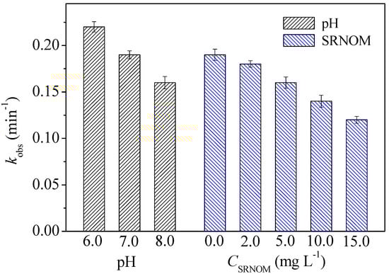 Observed degradation rate constant (kobs) of CTZ in UV/chlorine system in different pH or in the presence of SRNOM with different initial concentrations ([CTZ]0 = 10 µM, (Free chlorine)0 = 100 µM. The error bars represent the 95% confidence interval (n = 3)).