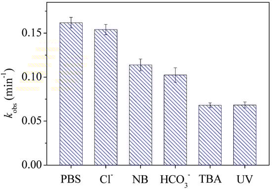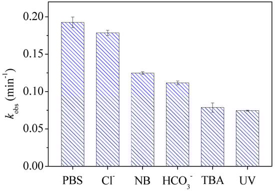 Observed degradation rate constant (kobs) of CTZ (10 µM) in UV/chlorine system ((Free chlorine)0 = 100 µM) under different conditions (PBS, pH = 7.0; (Cl−) = 50 mM; (NB (nitrobenzene)) = 2 µM; (HCO3−) = 100 mM; (TBA (tert-butanol)) = 100 mM) and in UV system as a control (the error bars represent the 95% confidence interval (n = 3)).