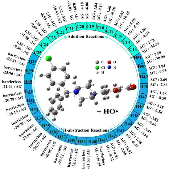 For the HO•-initiated H-abstraction and addition reactions, the values of ΔG and ΔH were all < 0 (Figure 6 and Table S2), implying that H-abstraction from CTZ and HO• addition to the unsaturated bonds of the phenyl group of CTZ were all thermodynamically spontaneous. The values of ΔG‡ for the addition reactions were from 0.87 to 5.59 kcal mol−1, indicating that these reactions were also dynamically possible. The HO• additions on the C16 and C20 sites were with low ΔG‡ values (0.87 and 0.89 kcal mol−1, respectively), which indicated that the addition reactions at the two sites were more favorable. For the H-abstraction reactions, the ΔG‡ values for the pathways from the phenyl group (H41-49) and α-carbon (α-C) are from 1.72 to 10.52 kcal mol−1, and the pathways from the hydrocarbon chain (except that from the α-C) were all barrierless, which indicated that the H-abstraction reaction from the hydrocarbon chain of CTZ was more favorable. These results demonstrated the high reactivity of HO• with CTZ, which is in accordance with the extremely high reaction rate constant of HO• with CTZ (8.94 × 109 M−1 s−1) [43]. Meanwhile, these results are also in agreement with the experimental results that HO• plays an important role during the degradation of CTZ in the UV/chlorine system.