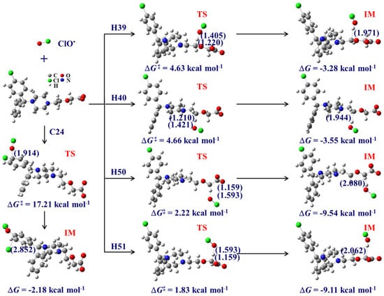 Detailed addition (C24 site) and H-abstraction (H39, H40, H50, and H51) pathways for the reaction of CTZ + ClO• (the values in the brackets are length of bonds marked with the dashed lines, and the unit is Å; TS and IM denote transition state and intermediate, respectively).