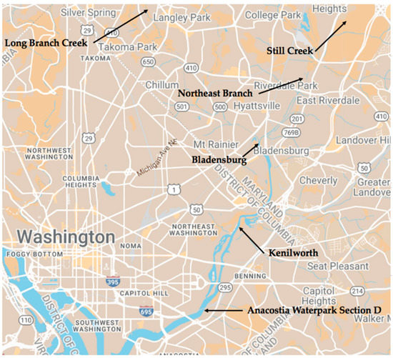 Site locations in and around Washington DC. Long Branch Creek is a tributary of Sligo Creek and then the Northwest Branch in Silver Spring and Takoma Park MD. Still Creek is located in Greenbelt Park, Greenbelt MD and is a tributary of the Northeast Branch, which was sampled adjacent to College Park MD. Bladensburg is immediately south of where the Northwest and Northeast Branches come together to create the Anacostia River’s main stem. The Kenilworth location is directly downstream of the Kenilworth Aquatic Gardens and is in an area that was a landfill between 1942 and 1970. The Anacostia Park (Section D) is upstream and across the river from the Navy Yard (Figure created using Google My Map).