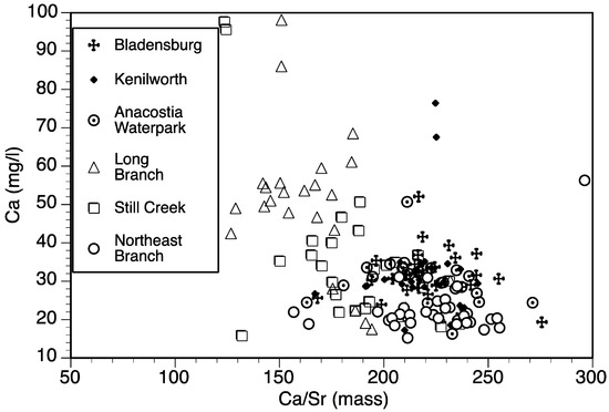 Ca/Sr > 200 in waters without carbonates (which is the case in the main stem of the Anacostia), suggests concrete as the calcium source (Figure 2). Additionally, dissolved Si was not correlated with the cations at any of the sites, suggesting that silicate mineral weathering was not a strong source of cations either. Still Creek and Long Branch had Ca/Sr ratios < 200 and Long Branch Creek had higher Ca than other sites. Given the high nitrate at Long Branch, it is possible that leaking sewer pipes are releasing both nitrate and calcium. Kaushal et al. [28] examined nitrogen stable isotopes in suburban Baltimore and found that lawn fertilizer was not a likely source of nitrogen (the δ15N of nitrate was higher than expected for ammonium fertilizer) and leaking sewers were the likely source. It is possible that is also the case in the suburban Anacostia watershed.