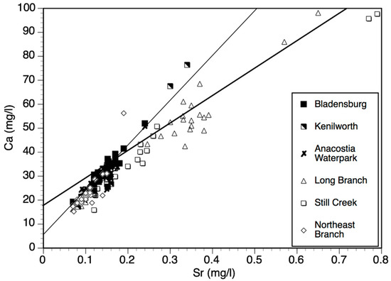 If Sr correlates more strongly with Mg than Ca, it points to other sources for Ca than carbonate [24]. The correlation for Ca vs. Sr is 0.89 for all sites combined and for Mg vs. Sr is 0.80. However, as shown in a regression of Ca vs. Sr, there is a clear difference in the relationship between some sites (Figure 5). The two suburban sites with higher Ca also have higher Sr relative to the other four sites. The regression for the Long Branch and Still Creek has a shallower slope relative to the urban sites plus the Northeast Branch because of the higher Sr concentration. Bu et al. [24] show a regression (Ca vs. Sr.) that is similar to the more urban sites (thicker line), although they report a lower r2 (0.88) and have lower concentrations for both cations than in the urban Anacostia sites. The river examined by Bu et al. [24] exists in a carbonate-dominated watershed (Jinshui River basin, China) which the Anacostia partially resembles but only because of artificial carbonates (concrete) in the more urban sites.