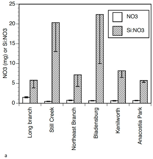 (a) Means with standard deviation for nitrate and Si:NO3 (SD in negative direction only) and (b) medians for Si:NO3 and mean nitrate with standard deviations for the six sites. Long Branch, Still Creek and the Northeast Branch are all tributaries of the Anacostia and considered “suburban”. Bladensburg (MD), Kenilworth (DC) and the Anacostia Park Section D (DC) are all on the main stem. Dissolved silica is decreasing in impounded or eutrophic rivers, and a trend with development has been lower Si and elevated NO3. Natural rivers in the early 1900s and prior had Si:NO3 ratios of 10 or more. Currently, agriculturally impacted rivers have ratios of less than 1.0 (in the Mississippi for example) [23].