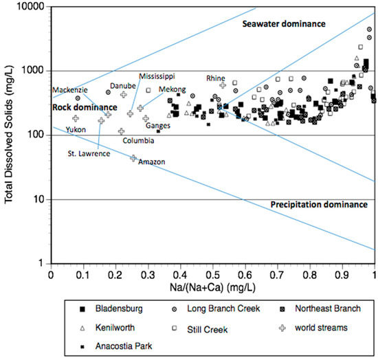 In 1970, Gibbs published a classic figure plotting Na/(Na + Ca) versus total dissolved solids (TDS) as a way of identifying the sources of river water [29]. Large rivers are generally grouped within the “rock dominance” region of the figure (Figure 4). Plotting the six sites examined in this study clearly shows that the Anacostia and its tributaries are often beyond the range usually observed for rivers. The elevated Na at base flow (salinization syndrome, a more specific characterization of urban stream syndrome) pulls the water chemistry away from what is normally observed in freshwater [9]. The TDS values approaching 1000 mg/L and above (almost brackish) indicate road salting during the winter months.