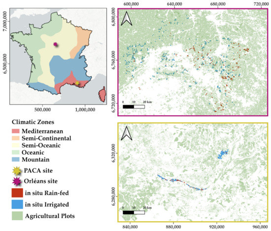 Location of the two study sites in Orléans (magenta star) and PACA (yellow star). Red and blue plots represent rain-fed and irrigated reference in situ plots, respectively. In green are the agricultural plots used for irrigation mapping in each site. Climatic zones of France are derived from MeteoFrance.