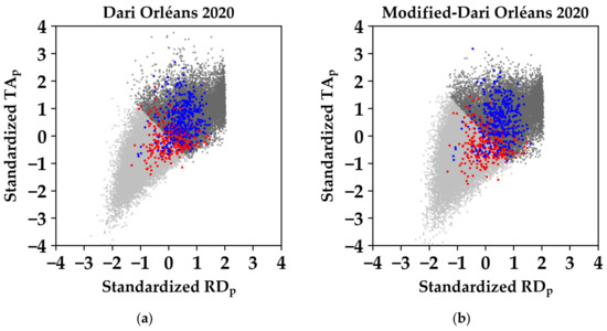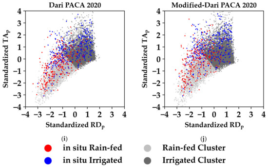 Scatter plots of the standardized (x-axis) and (y-axis) values for the agricultural plots with the resultant two K-means clusters of both Dari and modified Dari models. The dark gray cluster represents the agricultural plots classified as irrigated, while the light gray cluster represents agricultural plots classified as rain-fed. The blue and red points represent the and scatter plot of irrigated and rain-fed in situ terrain datasets for each study case, respectively. (a,b), (c,d), (e,f), (g,h) and (i,j) represent (Dari model, modified Dari model) for Orléans 2020, 2019, 2018, 2017 and PACA 2020 respectively.