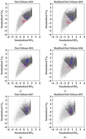 In the study case of Orléans 2020, the Dari model showed that 132 reference rain-fed plots are located in the rain-fed cluster (light gray), thus correctly classified as rain-fed while 159 reference rain-fed plots were misclassified by the K-means cluster as they appear to be in the irrigated point cloud (Figure 2a). The irrigated plots are better classified than the rain-fed plots in the Dari model where 357 irrigated reference plots were correctly classified as irrigated and only 32 irrigated reference plots are misclassified (Figure 2a). Using the modified Dari model proposed in this study, rain-fed plots were better classified as 185 rain-fed plots were correctly classified, versus 106 misclassified rain-fed plots. For the irrigated class, similar results are obtained between both Dari and modified Dari models (Figure 2b).