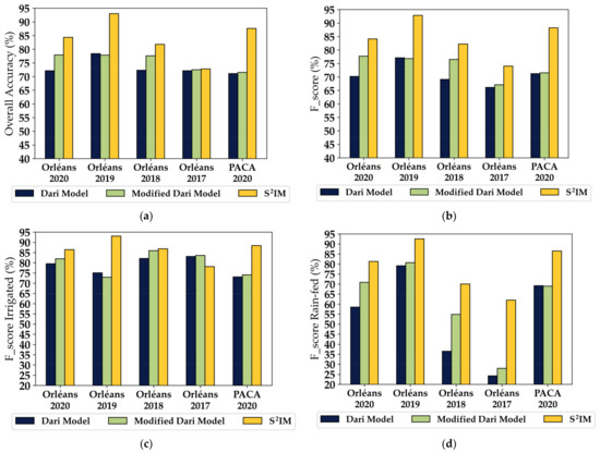 For the rain-fed class accuracy (Figure 3d), the F-score of the rain-fed class in Orléans 2020 increased by 12.2%, from 58.5% using the Dari model, to 70.8% using the modified Dari model. Similarly, in Orléans 2018, the accuracy of the rain-fed class increased by 18.4% from 36.5% using the Dari model to reach 54.9% using the modified Dari model. In Orléans 2019 and PACA 2020, the rain-fed class maintained the same F-score value for the Dari and modified Dari model reaching 80% and 69% for the two cases, respectively. In Orléans 2017, the F-score of the rain-fed class remained stable between the Dari and modified Dari model (24%). Finally, the S2IM also showed the highest F-score value of the rain-fed class for the five study cases reaching 81.3%, 92.5%, 70.0%, 62.0% and 88.4% for Orléans 2020, 2019, 2018, 2017 and PACA 2020, respectively.