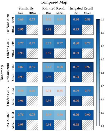 The three models (Dari, modified Dari and S2IM) were applied on both study sites in Orléans and PACA. For Orléans, the accuracy of the classification of the S2IM performed each year (2017, 2018, 2019 and 2020) was previously assessed by Bazzi et al. [20] using the corresponding in situ data terrain data collected each year, whereas the accuracies of the Dari and modified Dari models were assessed in this study using the same in situ dataset. For PACA, the three models were tested for the year 2020 where the terrain in situ data are available. The evaluation of the models’ performance over all site/year study cases was achieved using the common accuracy metrics usually used to assess classification aspects [45,46]: overall accuracy (OA), the F-score, the F-score of the irrigated class and the F-score of the rain-fed class. In addition to the accuracy assessment using in situ data, we intercompare between the irrigation maps originated from the three models. The intercomparison tends to assess the similarity between each model map in order to understand the behavior of each model with respect to other models. In the comparison between two irrigation maps, one map from one model is considered as the base map and the second map is considered the compared map. The similarity between each combination of two maps from two different models was assessed by means of the overall similarity and the recall metric for each class (irrigated and rain-fed). The overall similarity reports the ratio between the number of agricultural plots commonly classified in the same class in both the base and compared maps to the total number of agricultural plots classified. The recall metric of each class reports the ratio between the commonly classified plots in a given class (rain-fed or irrigated) divided by the total number of the plots of this class in the base map. While the overall similarity can give general information about the concurrence of two maps, the recall metric helps to assess the over and underestimation of a class in a map with respect to the other map.