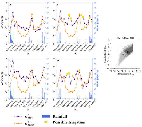 Temporal series of S1-VV backscattering coefficients at plot scale () in indigo and basin scale in orange between June and September 2019 for four different plots in Orléans: (a,b) are, respectively, rain-fed and irrigated reference plots correctly classified in Dari and S2IM models, (c,d) are, respectively, rain-fed and irrigated reference plots misclassified in the Dari model and well classified in the S2IM. Blue bars show the rainfall data. Yellow crosses represent potential irrigation events on the plots. The cluster figure to the right shows the irrigated/rain-fed clusters generated by the K-means model overlaid with the four plots. According to in situ data, plots A and C are rain-fed whereas plots B and D are irrigated.