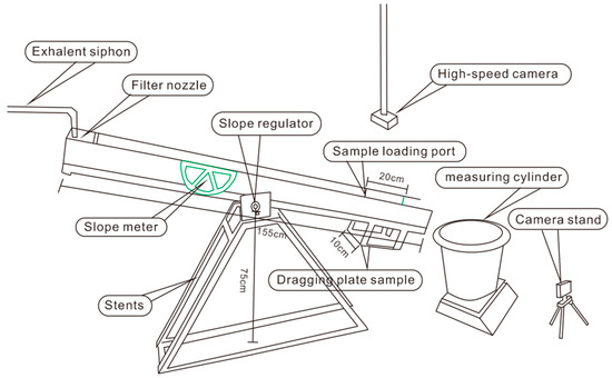 Under normal rainfall conditions, natural slope surfaces have a certain level of laminar scour [15]. The erosion intensity in different areas is different, depending on the soil type [16]. Studies have found that water flows much faster on saturated slopes than on unsaturated slopes, and soil moisture and dry density affect slope erosion [17]. Other scholars have found that rainfall intensity and slope gradient play an important role in slope erosion [18]. Some studies have found through artificial rainfall tests that slope runoff can be divided into three flow zones: laminar flow, flocculation flow, and excessive flow. These studies have shown that water flow under normal rainfall conditions occurs in a laminar state [19,20] and under the scouring effect of laminar flow, soil on slope surfaces can be separated and transported [21]. Erosion resistance has been used as an indicator of the soil’s ability to resist runoff dispersion and suspension, mainly reflecting the internal properties of the soil [22]. In order to better understand the mechanism of soil erosion under water scouring, laboratory flume experiments were conducted with three rainfall intensities and four scouring inflow rates to evaluate their interaction [23,24]. Through rainfall experiments, it was found that there are differences in the expression of characteristic parameters of influencing factors [25,26]. Soil erosion resistance, on the other hand, refers to the ability to reduce runoff damage and mainly reflects external factors [26,27].