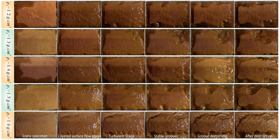 From the laboratory simulation test results (Figure 4), it can be seen that under the same water content conditions, the process of forming a drop pit is slower when the initial dry density of the specimens is smaller. The development of fine grooves is also later when the initial dry density of the specimens is smaller. The appearance of the drop pit has a certain degree of randomness, and the appearance of a drop pit is a sign of the beginning of fine groove erosion. It is also a prerequisite for the development of fine channels.
