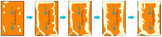 The hydraulic erosion process on the slope surface of the loess specimen is shown in Figure 3. From this figure, it can be seen that the surface of the specimen is first face-flowed to produce sheet erosion. With the increase in scouring time, the slope surface gradually exhibits fine furrows, and the water flow changes from sheet diffuse flow to concentrated linear flow. Following this description, the hydraulic erosion process of the loess slope can be generalised as shown (Figure 4).