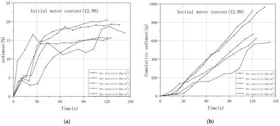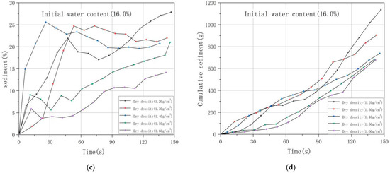 Curves of representative sediment discharge and cumulative curves of the representa-tive sediment discharge. Initial water content (12%) sediment (a); Initial water content (12%) cumulative sediment (b); Initial water content (16%) sediment (c); Initial water content (16%) cumulative sediment (d).