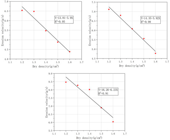 The relationship between the average erosion rate of the specimens and the initial dry densities is shown in Figure 6. As can be seen (Figure 6), there is a significant negative correlation between the initial dry density of the specimens and the erosion rate. This result indicates that the resistance of the loess to scour and erosion increases significantly with increasing initial dry density at the same initial moisture content. The main reason for this is that as the initial dry density increases, the shear strength index of the loess specimen increases, and the critical initiation shear force of the loess particles increases [31].