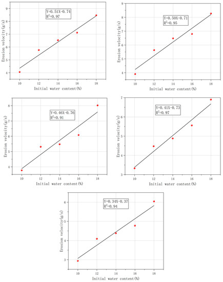 The relationship between the average erosion rate of different initial moisture content specimens under the same initial dry density conditions is shown in Figure 7. It can be seen from Figure 7 that the initial moisture content of the specimen and the erosion rate show a significant positive correlation, i.e., the erosion rate of the loess specimen increases with the increase in the initial moisture content under the same initial dry density conditions. The main reason for this is that as the initial water content increases, the salt crystal film around the particles is dissolved and the strength of the association between the particles is gradually weakened, resulting in a reduction in inter-particle cohesion. In addition, the increase in water content weakens the matrix suction and capillary action between the soil particles, which, together with the lubricating effect of free water, ultimately leads to a reduction in the resistance of the loess to erosion [31].