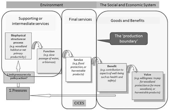 The CICES cascade framework for ecosystem services (ES). Reprinted with permission from, [14]. Copyright 2018, Potschin-Young et al.