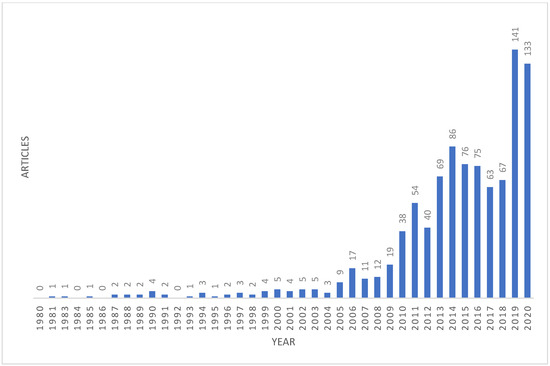The 1062 journal articles identified were published between 1980 and 2020, during which period there was a continuous increase in the number of publications, as can be seen in Figure 2.