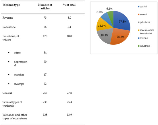 The most studied wetlands were coastal ones, with studies involving more than one class of wetland (‘several’) and also involving other types of ecosystems (‘several, other ecosystems’) coming next (Figure 3).