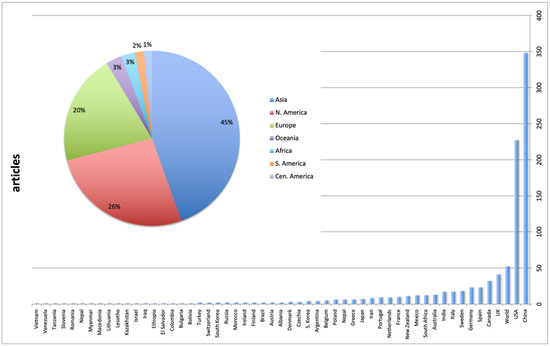 In terms of location, Asia produced the highest number of wetland studies (45%) with China heading that continent’s share, followed by North America (26%) and Europe (20%) (Figure 4).