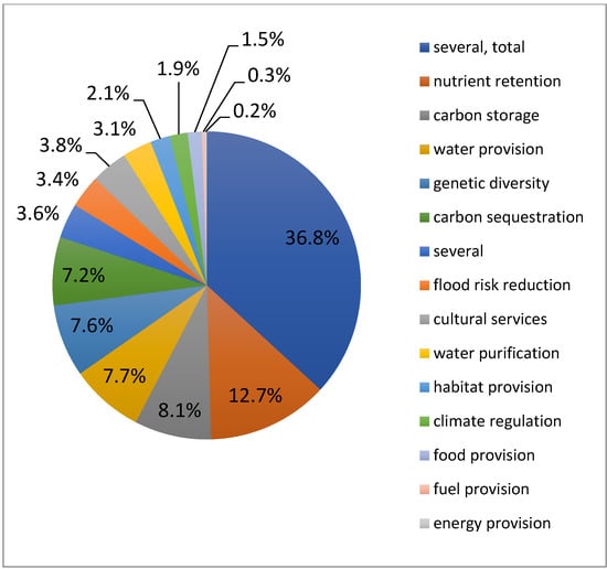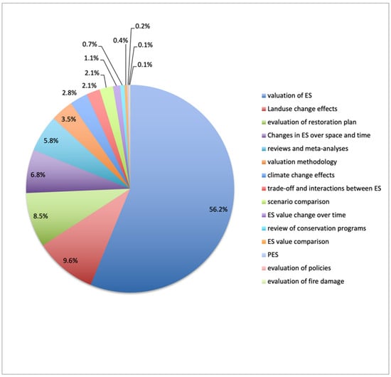 The subject area with the highest number of the ES wetland studies (56.2%) was the valuation of one or more ES, with the evaluation of trade-offs and interactions between ES coming next (9.6%), as shown in Figure 5.