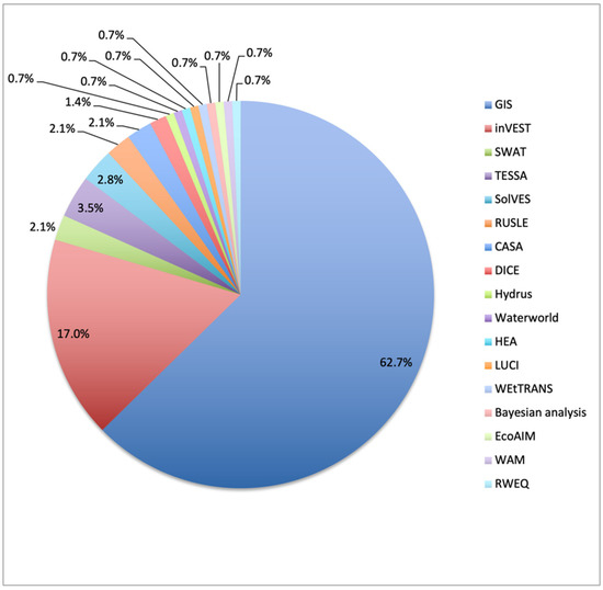 Figure 9. Software tools used for the wetland-related ES studies identified in SCOPUS (between 1980 and 2020). (see Appendix A, Table A1 for an explanation of the acronyms and the use of the tools).