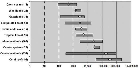 Summary of mean monetary values of ES per biome (values in USD/ha/year, 2007 price levels). Reprinted with permission from [8]. Copyright 2012, De Groot et al.
