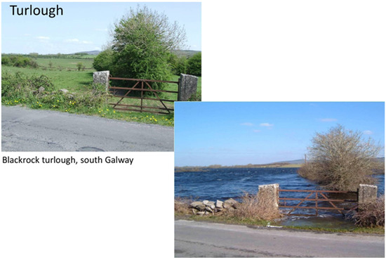 Turloughs are hydrologically similar to poljes in terms of their periodic inundation and lacustrine deposits [63], though they are generally smaller than polje and their origin is more complicated [60] (Figure 11). Turloughs are present mostly in the Republic of Ireland, west of the river Shannon, with only three others present in Northern Ireland and one in South Wales.