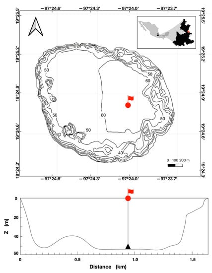 The climate is temperate and semi-arid with an average temperature of 12.9 °C, rainfall < 500 mm year−1, concentrated in the (“summer”) rainy season, and evapotranspiration rate up to 1690 mm year−1 []. It is a deep lake (maximum depth 62 m, mean depth 40.9 m), circular in shape (maximum length 1902 m), with a surface area of 2.367 km2, a shoreline of 5.84 km, and a volume of 114,688,900 m3 []. The lake is saline (total dissolved solids = 10.08 g L−1, electrical conductivity = 13.53 mS cm−1) with chloride, bicarbonate, sodium, and magnesium as dominant ions and an alkaline pH (8.7–9.2) [,]. Alchichica is a warm monomictic lake that circulates during the cold, dry season, from the end of December or the beginning of January to the end of March or the beginning of April. The lake remains stratified throughout the warm rainy season, and the hypolimnion becomes anoxic for most of this period []. Lake Alchichica is oligotrophic with an overall nutrient concentration of <4 µmol L−1 at the mixed layer [].