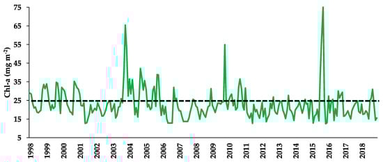 Temporal dynamics of the water-column integrated chlorophyll-a concentration (Chl-a) in Lake Alchichica. (The dashed line indicates the average Chl-a value from 1998 to 2018).